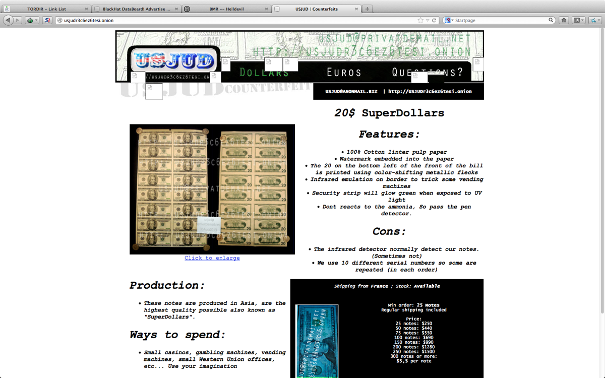 On a site called BlackMarket Reloaded, a user named Torrunner sells counterfeit U.S. bills for around 25% of their face value. (Torrunner recommends that new purchasers also buy a publication called “The Guide for Passing $100 Counterfeits.”) More than sixty buyers have left mostly positive feedback on Torrunner’s counterfeits.