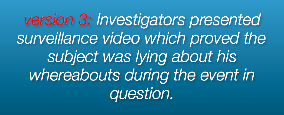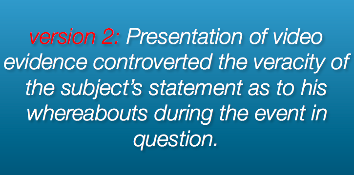 We can do better. Let’s eliminate the ponderous phrases, “presentation of video evidence” and “veracity of the subject’s statement.” By replacing words like “veracity” and “presentation” with more specific and ordinary words, I think we can get a little closer to the facts of who did what, when: