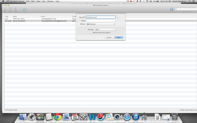 Method 2: This is the private way of sharing public keys. Begin by right clicking your key in the PGP Keychain Access and then click export. This will generate a Public PGP file with the file extension .asc. Be sure that “secret key export” is unchecked. You only want to export your public key and you never want to share your private key. You can name your file and then export it to save wherever it is convenient.