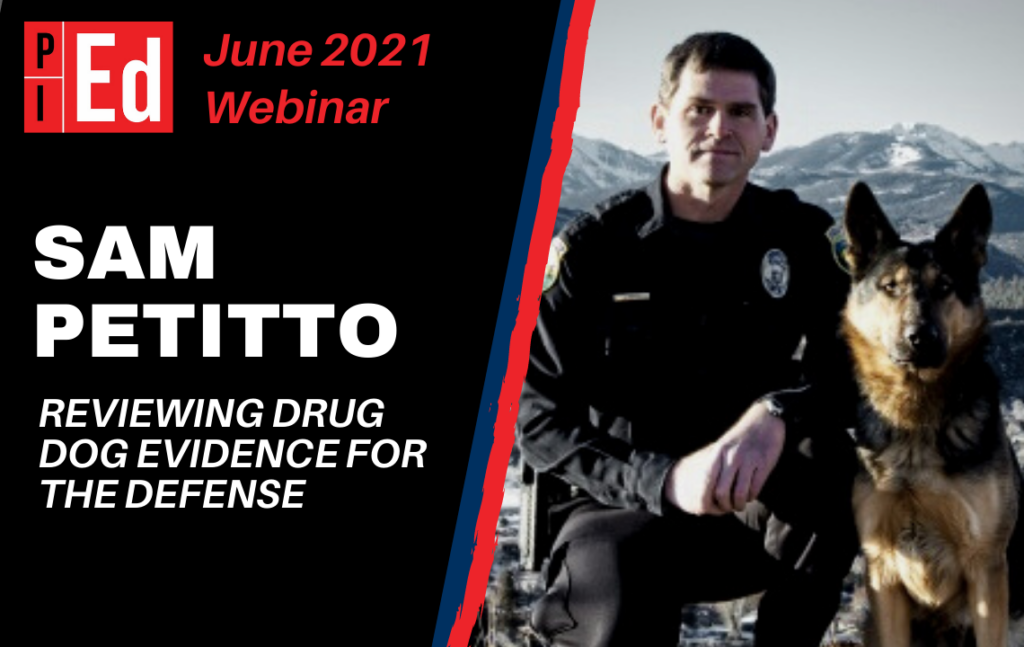 Sam trained dogs as a law enforcement officer. As a PI, he’s carved out a specialty in drug dog defense work. In the webinar, I ask Sam to share what he learned about drug dog training and evidence during his years in law enforcement, and he tells the story of how he built his book of work doing drug dog defense.