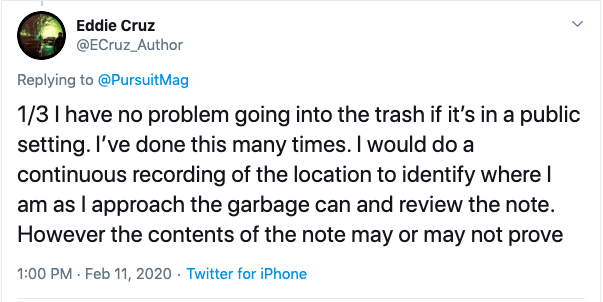 If they’ve been surrendered, the trash bin is on a public alleyway, and it’s legal in your area to take the trash, take it. Gather the flowers and the note and document the entire process. This can be fantastic evidence.