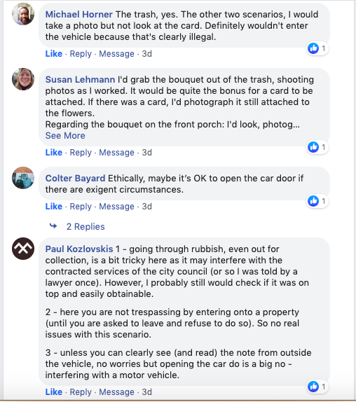This one is a little trickier. I will not trespass. If the flowers are clearly visible, I’ll take a picture. My issue with walking onto the porch is one of contacting a represented party. I do not want to even appear to communicate with a person who is represented by an attorney.